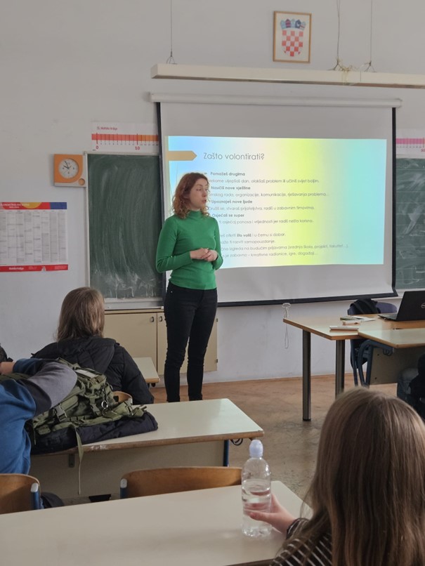U ponedjeljak, 1. prosinca 2025. učenici volonteri i koordinatorica Školskog volonterskog kluba Petra Relja, ugostili su gđu Antoniju Matković Puljek iz Udruge „MI“ i Volonterskog centra Split. Predavanje je održano povodom Međunarodnog dana volontera koji se obilježava 5. prosinca 2025. Na predavanju su učenici saznali odgovore na pitanja: Što znači volontirati? Koje su obveze volontera? Koja su prava volontera? U kojim se organizacijama može volontirati? Zašto se ljudi odlučuju na volontiranje? Na kraju predavanja su učenici pogledali edukativni film o volontiranju. Opća skupština Ujedinjenih naroda proglasila je 2026. godinu Međunarodnom godinom volontera za održivi razvoj. Obzirom da smo od ove školske godine u projektu zajedno s Volonterskim centrom Split, druženje smo iskoristili i za dogovaranje daljnje suradnje i zajedničkih projekata. Veselimo se susretu na obilježavanju Međunarodnom danu volontera 5. prosinca u Splitu, kada će učenici naše škole dobiti zaslužena priznanja.
